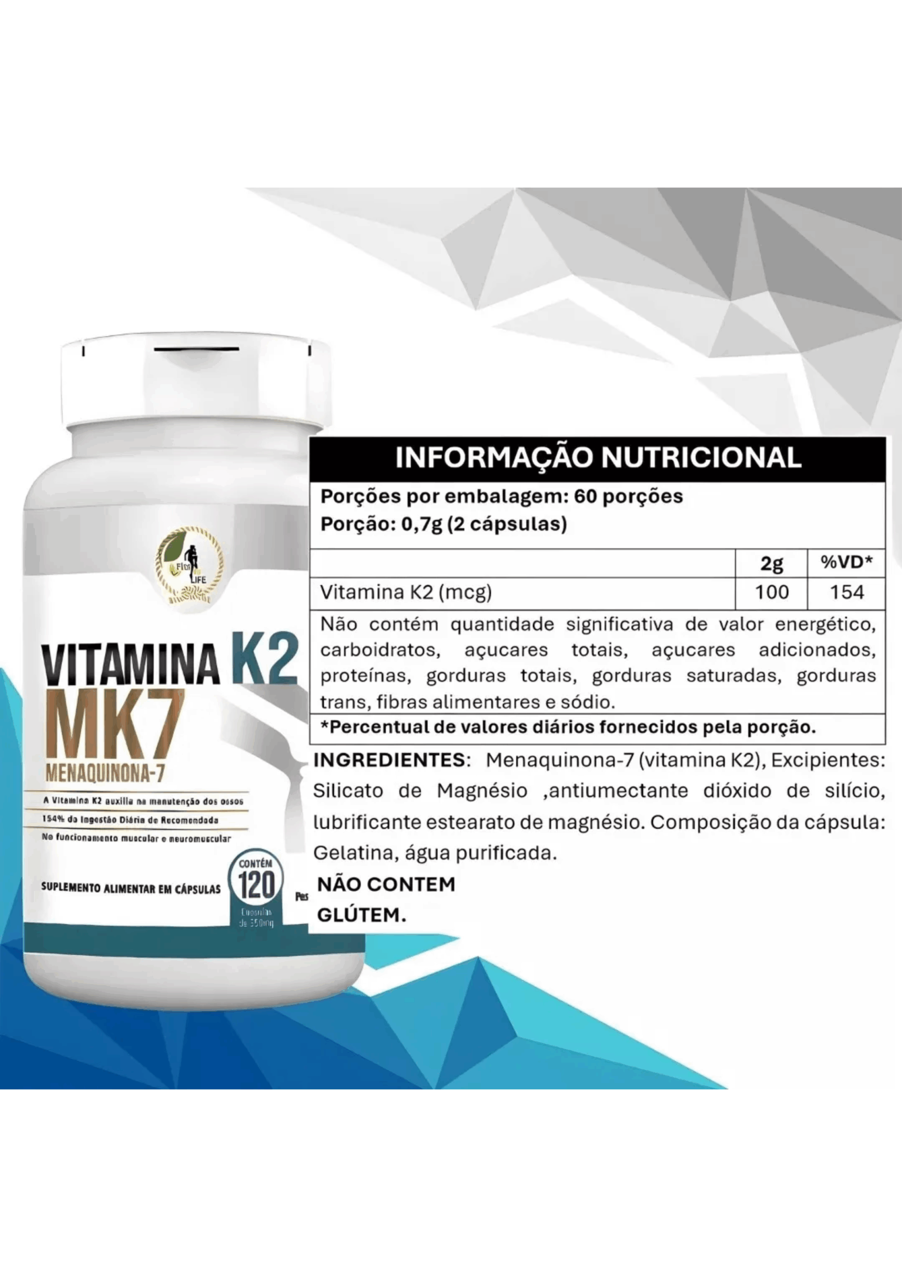Este produto é um frasco de Vitamina K2 MK7 (Menaquinona-7), contendo 120 cápsulas. A K2 MK7 é a forma mais biodisponível da vitamina K, o que significa que ela é facilmente absorvida e utilizada pelo corpo para uma ação mais eficaz.